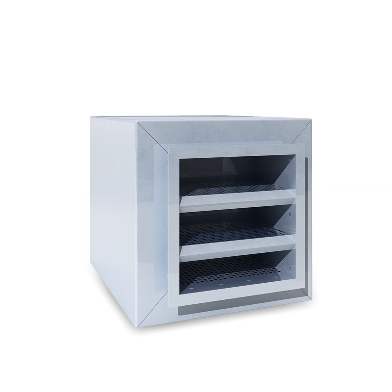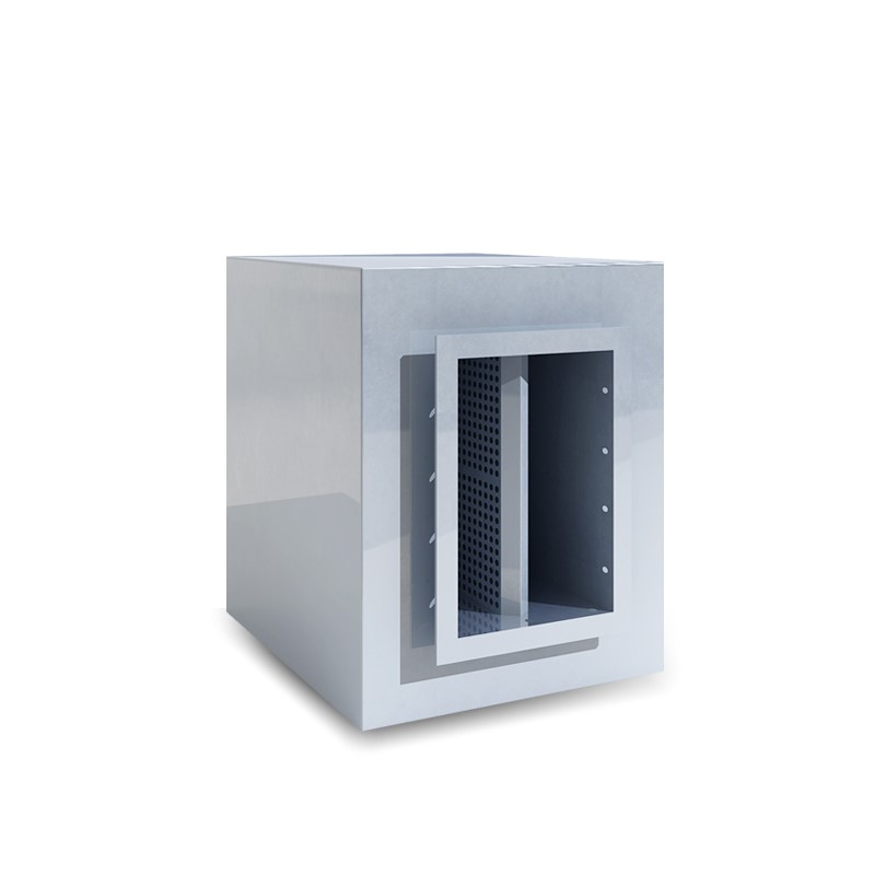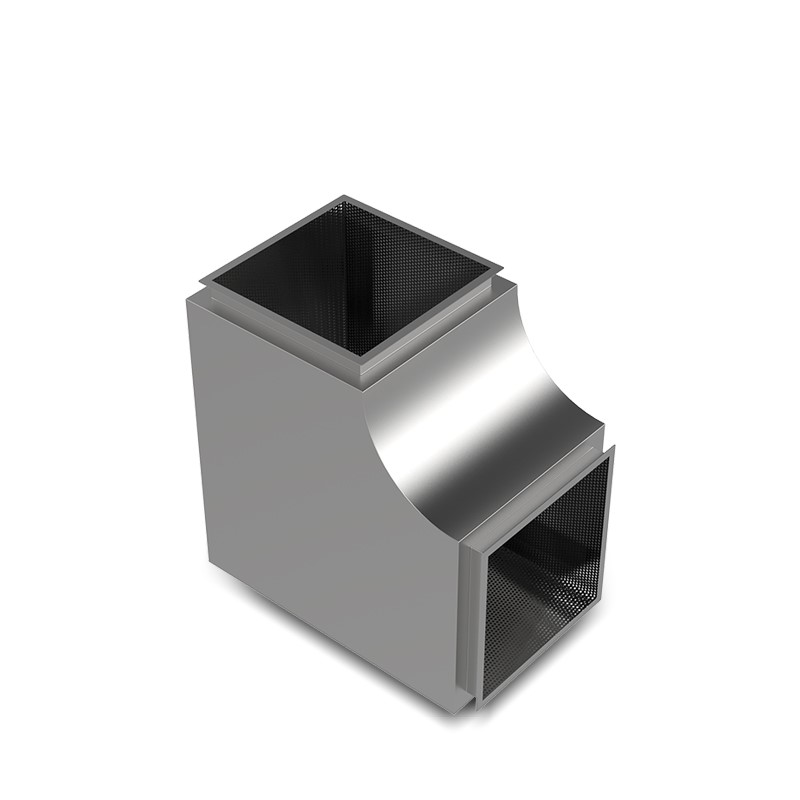 本消聲彎頭采用外角內(nèi)圓結(jié)構(gòu),有利于提高消聲效果,減小阻力損失,降低再生噪音,外殼采用鋼板( 或鍍鋅板),吸聲材料為玻璃布包超細(xì)玻璃棉,并以木框或鋼框作龍骨,保證吸聲材料在高速氣流下的穩(wěn)定性。