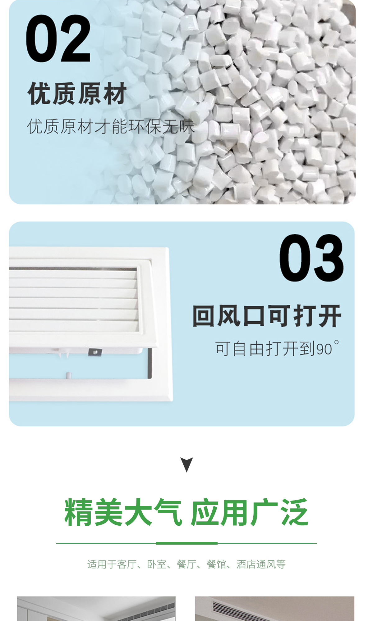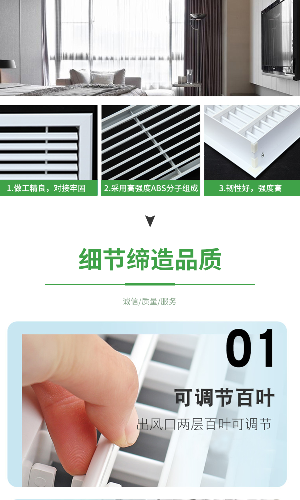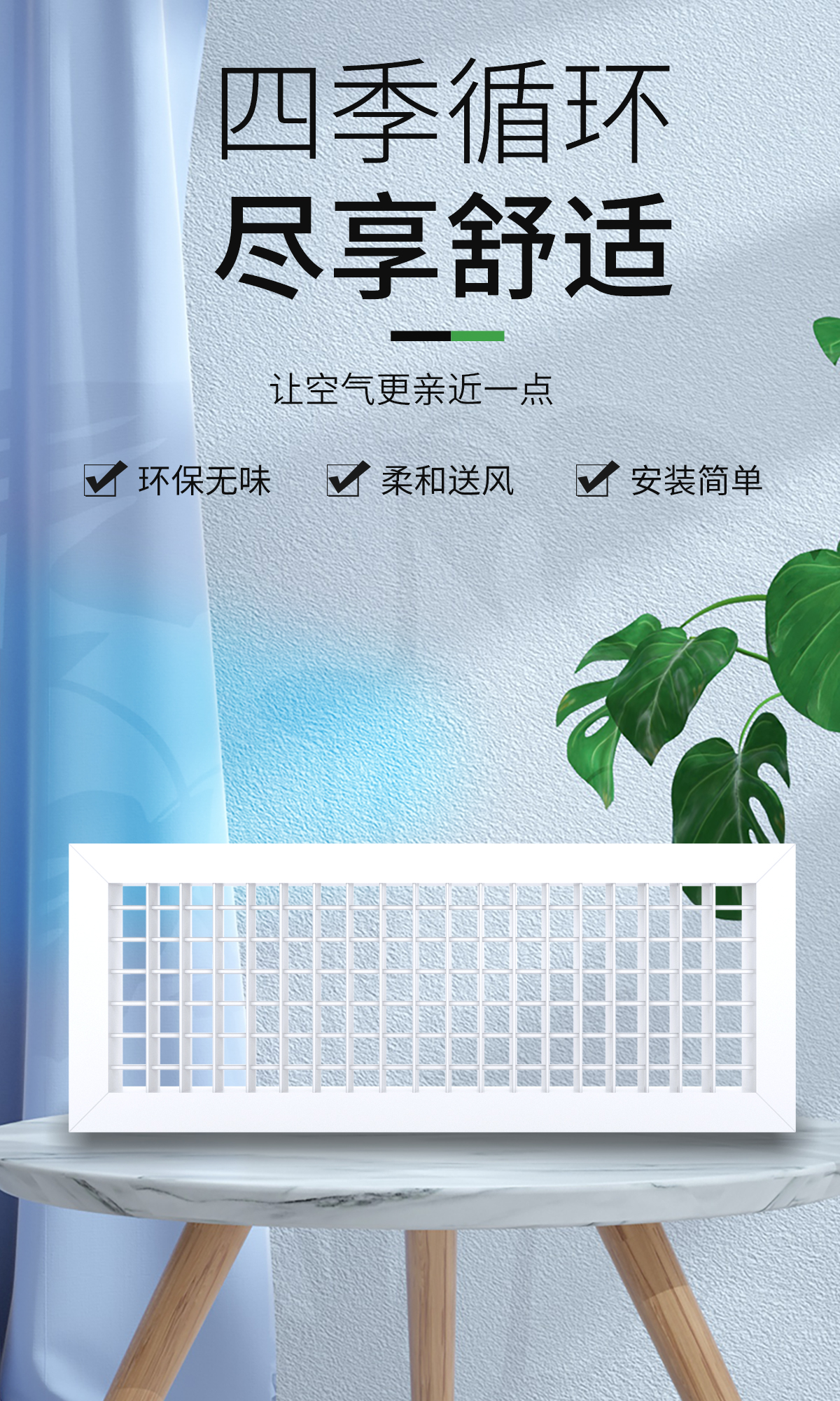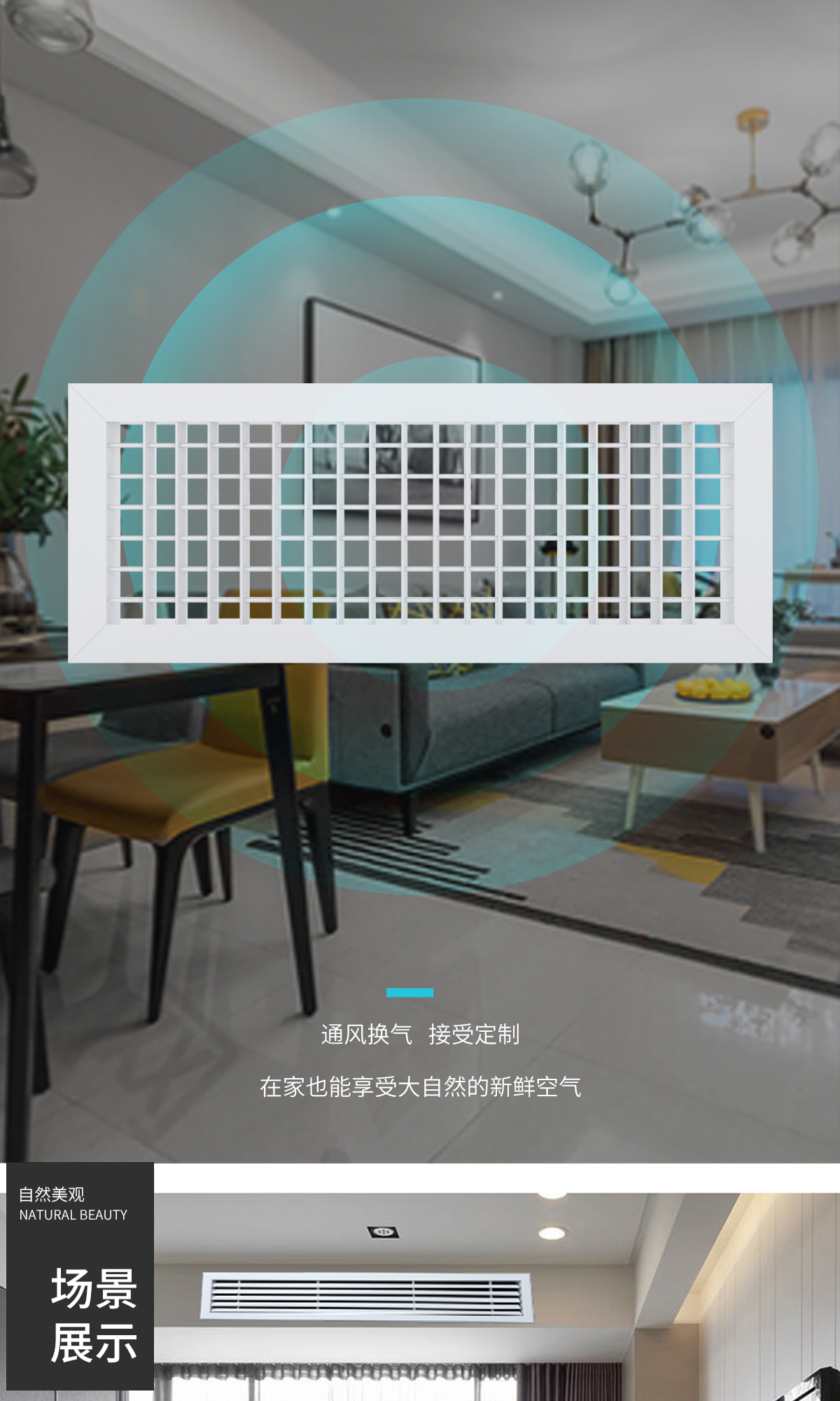 調(diào)節(jié)百葉式送風(fēng)口 可直接與風(fēng)機(jī)盤管配套使用 尺寸由用戶選定 可用于中央空調(diào)系統(tǒng)的末端,葉片角,度可在任意范圍內(nèi)調(diào)節(jié),葉片在不同角度,可得到不同的送風(fēng)距離和不同的擴(kuò)散角
