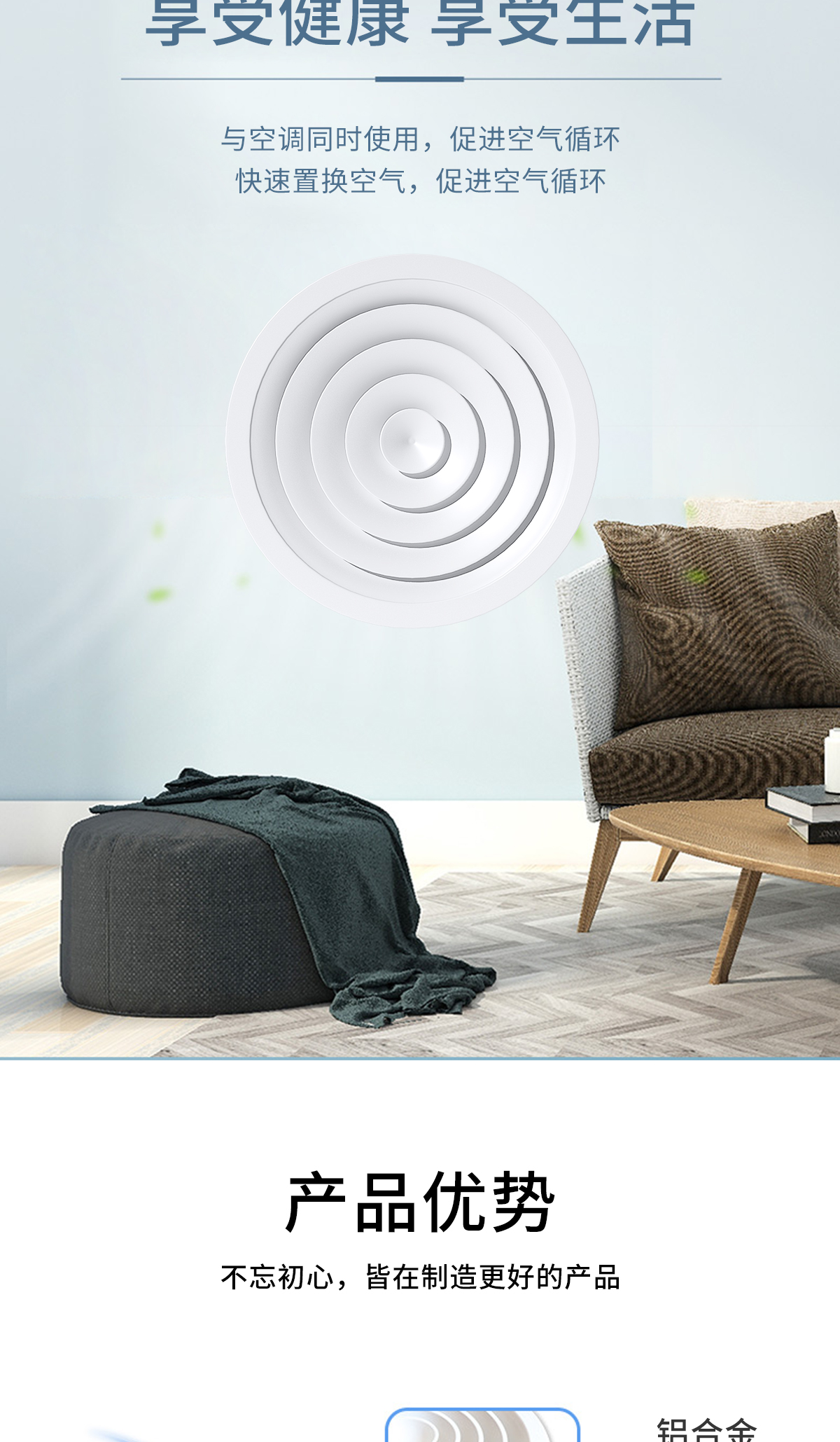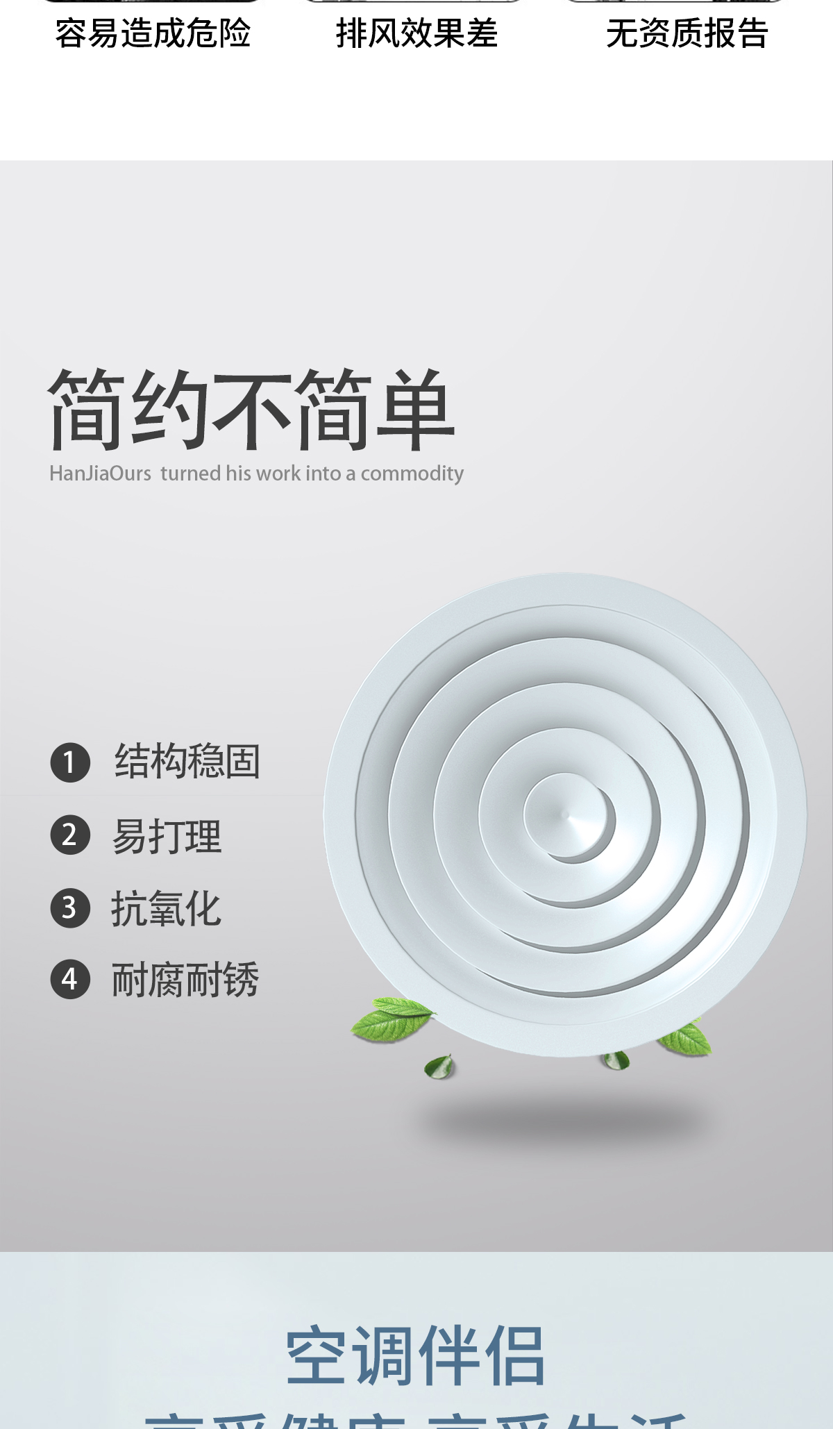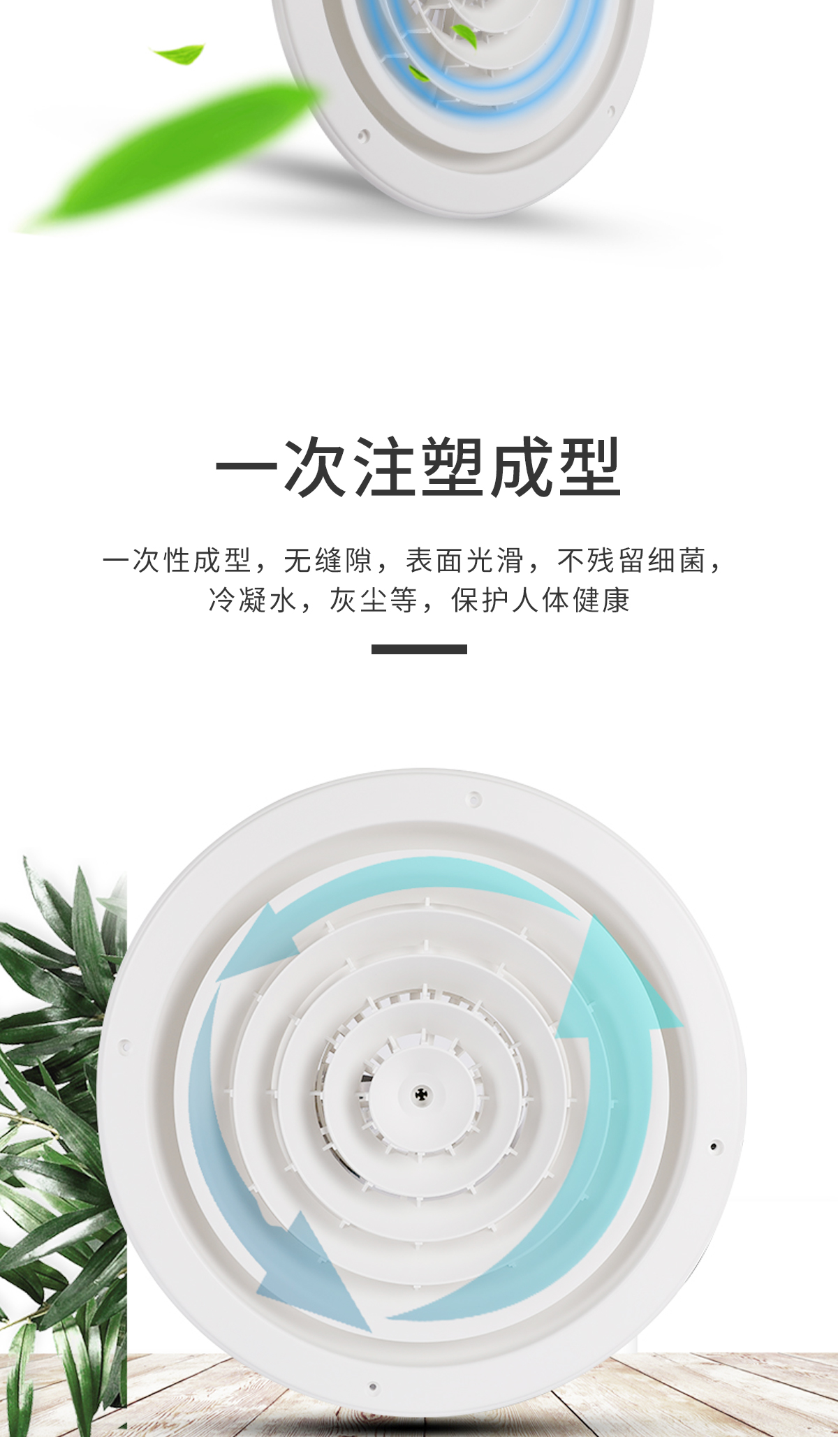 用于冷暖送風,常安裝在頂棚上 吹出氣流呈貼附(平送)型 可以供給較大的風量 在給定風量范圍內擴散半徑可大小變化 可與圓形對開調節(jié)閥配套使用