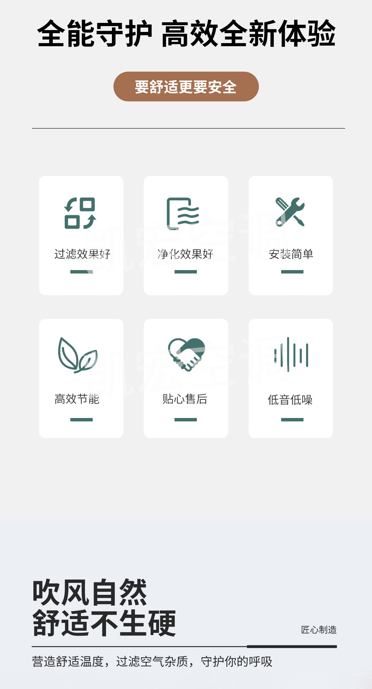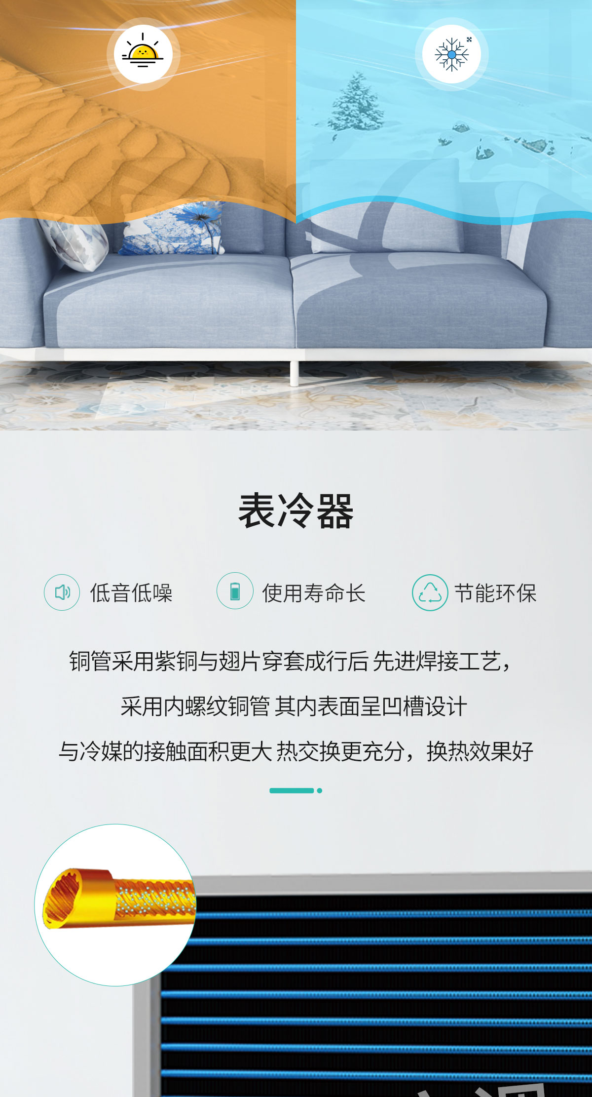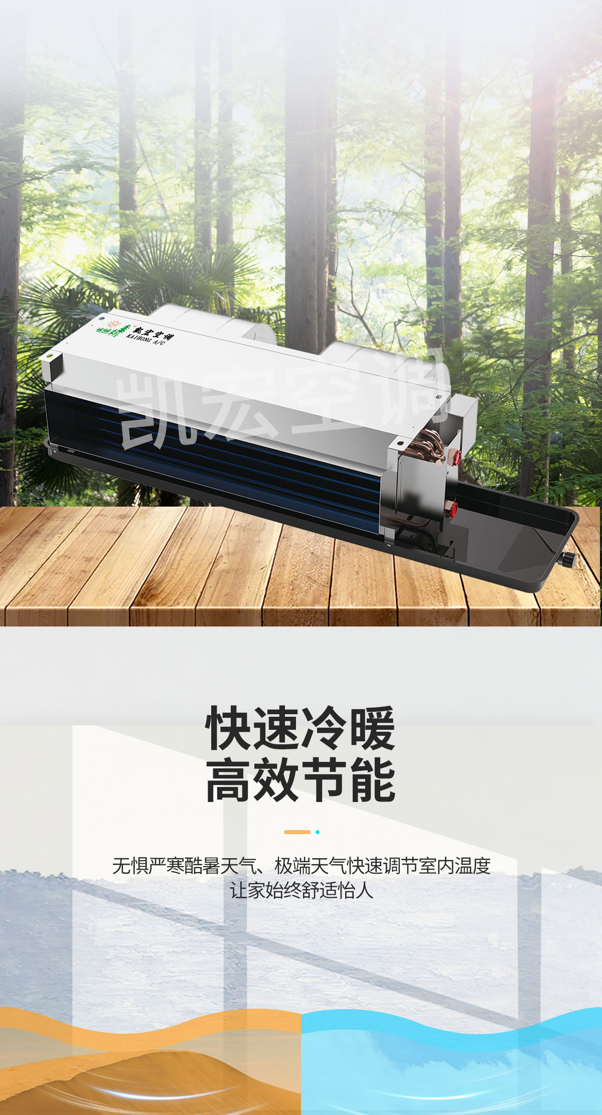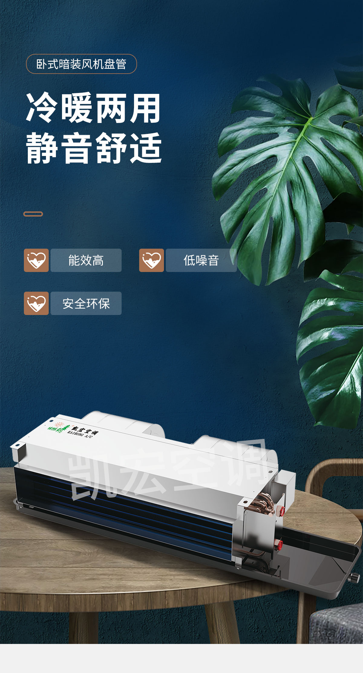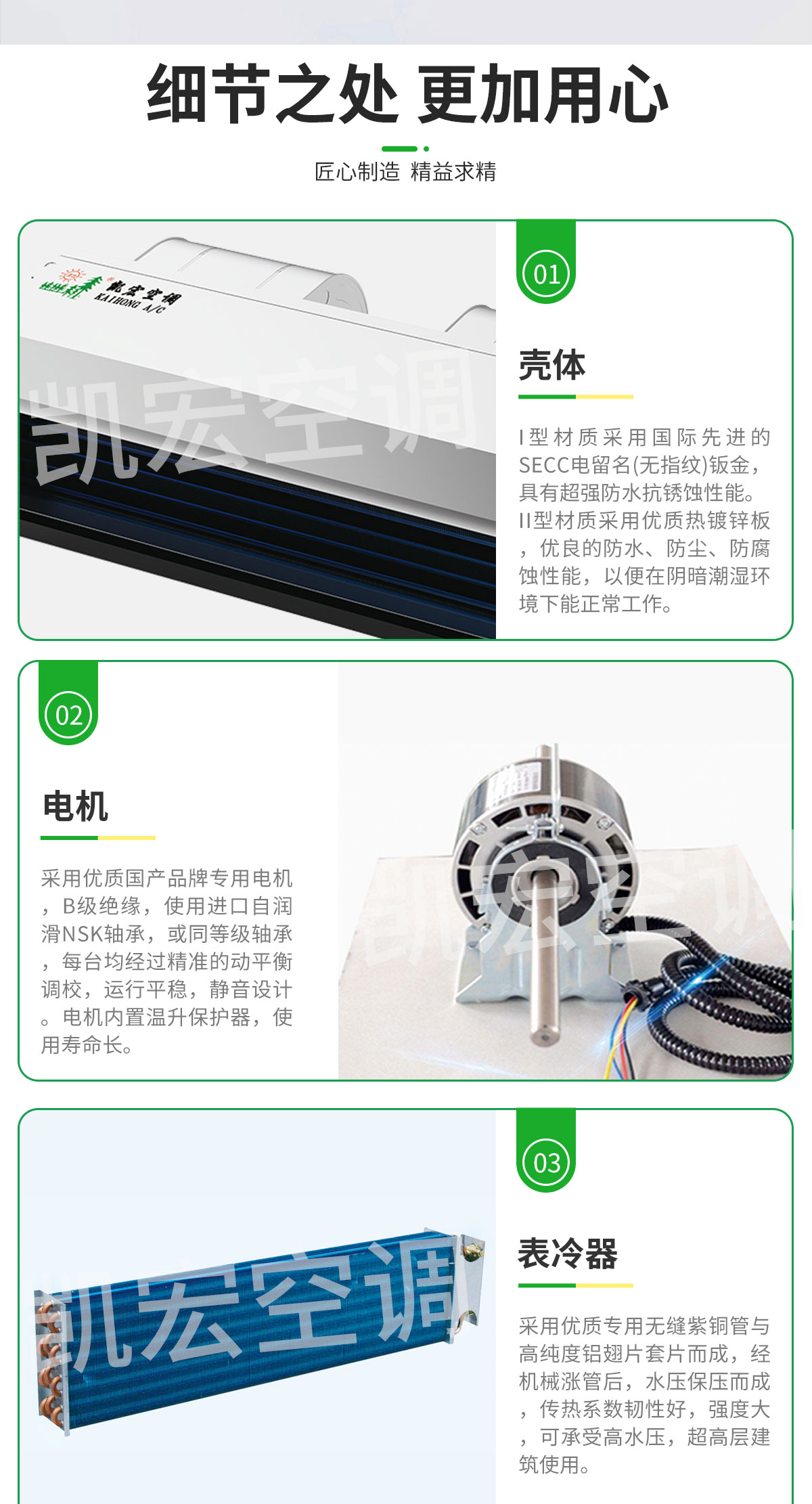 表冷器部件由臺灣弓|進的生產(chǎn)線制造,采用發(fā)卡式大彎管套多曲波紋雙翻邊鋁翅片,集束機械漲管,傳熱效率高,水阻、風阻 機箱采用寶鋼三期優(yōu)質鍍鋅板生產(chǎn)。強度高、耐腐蝕性強 風機部分采用全金屬風機和優(yōu)質名牌電動機及進口NSK免維護軸承,具有超低噪聲,保證機組寧靜、長久可靠地運行 凱宏卡式四出風風機盤管,采用全塑面板,外形美觀大方,徹底克服表面結露現(xiàn)象